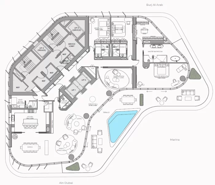The unit will bathe in copious amounts of light and air due to the full three-storey atrium where a stunning olive tree, over 1,000 years old will be located. Large terraces and two private infinity swimming pools with amazing views of Dubai will allow the owner of the penthouse to enjoy a truly, one-of-a-kind premium lifestyle.