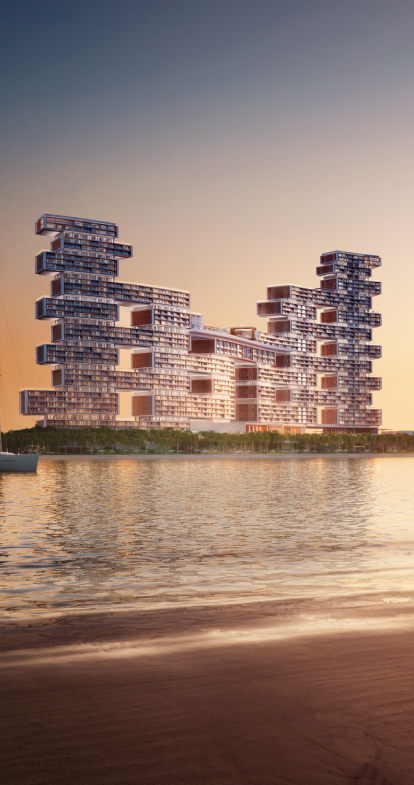 Located on the crescent of The Palm and next to the iconic Atlantis resort, this new generation of distinctive luxury will offer a sophisticated lifestyle with infinite ocean views, lush green spaces, and a playful contrast between fire and water, all encapsulated in dramatic architecture.